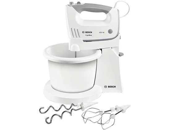 BOSCH mikser MFQ36460S ErgoMixx, Boja: BIJELA/SREBRNA ; 450W, 5 Brzina + Turbo ; Postolje s automatski okretnom zdjelom; Pribor: 2 standardne metlice; 2 kuke za miješanje, SL