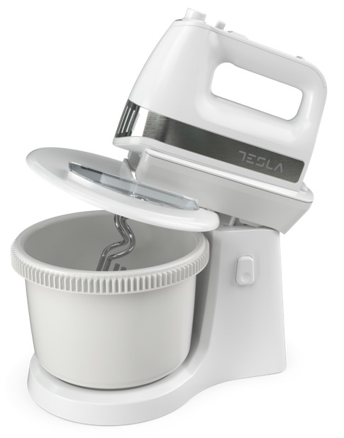 TESLA Mikser s posudom MX505WXB; Snaga motora: 500 W; 5 brzina s turbo funkcijom; Kapacitet: 2,5L učinkovito, 3,2L Max; Dugme za izbacivanje za otpuštanje dodataka; S kromiranim mješalicama i kukama; Sa samorotirajućom posudom; Sa poklopcem posude